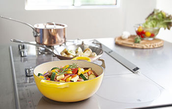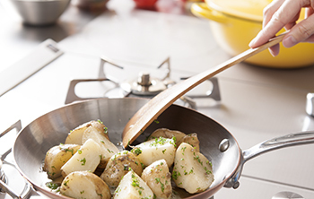 ガス2口と1口、IH2口のトリプル配列のハイブリッドコンロをビルトイン、主張しすぎないデザインで調理シーンを選ばず、すっきりと見せることができます。